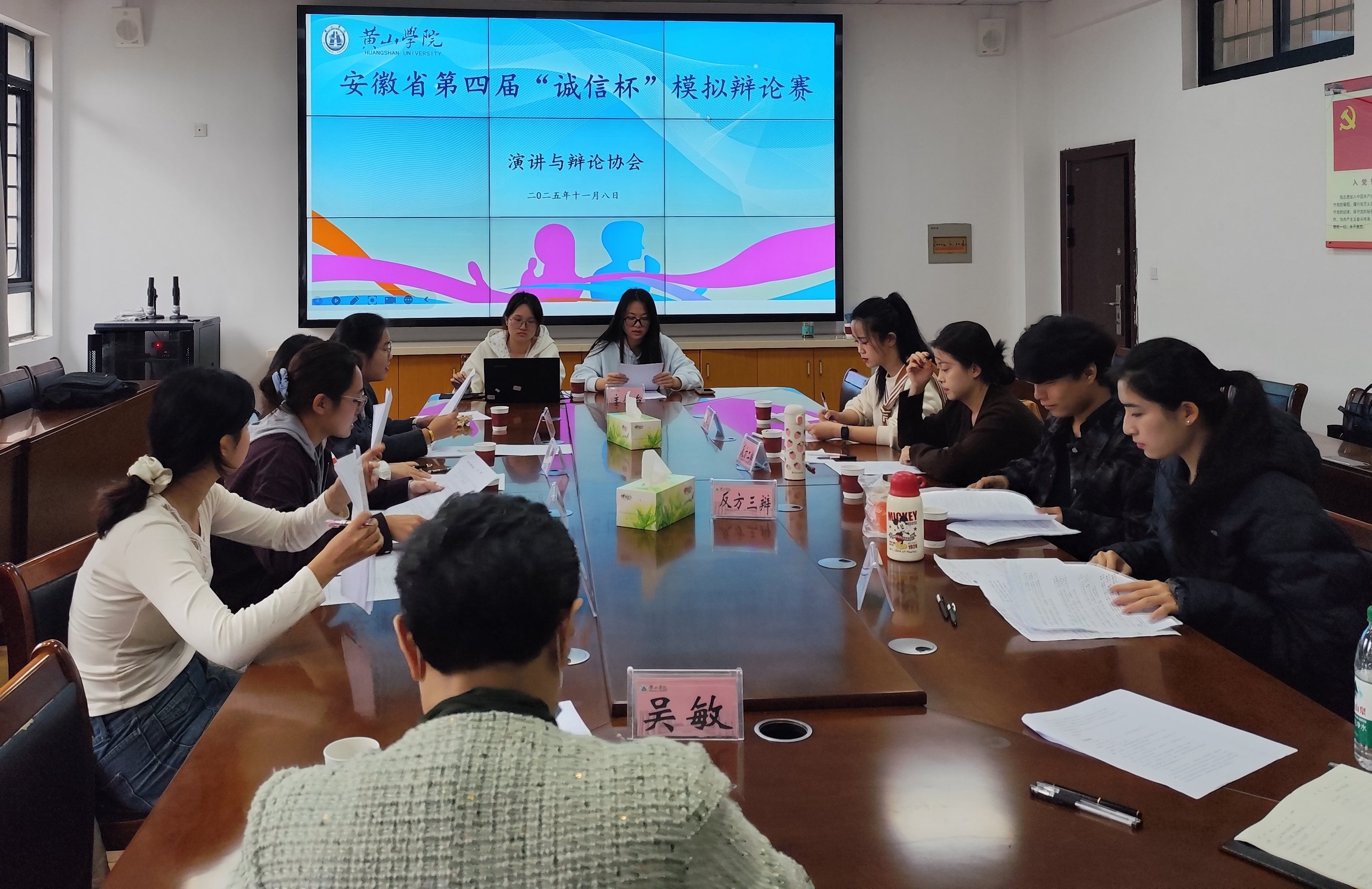 2025年11月8日上午9:00,安徽省第四届“诚信杯”模拟辩论赛首场比赛在文端楼二楼会议室顺利举行。两场精彩对决围绕文艺评价、文旅服务中的诚信议题展开,选手们以清晰逻辑与鲜明观点展开思辨碰撞,现场氛围热烈。