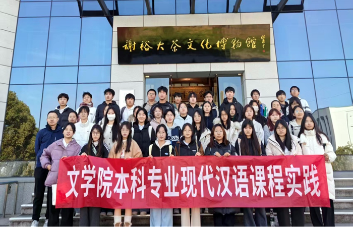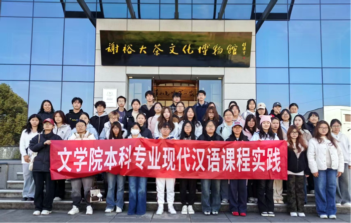2025年11月30日,文学院现代汉语课程实践活动在暖阳和煦的冬日里显得格外醒目,2025级中文1班、2班和汉国教班的同学一百余人乘坐大巴,在刘板和张伟两位老师的带领下,走进了谢裕大茶文化博物馆,开展了一场融合茶史探究、采制体验与语言学习的特色研学活动。