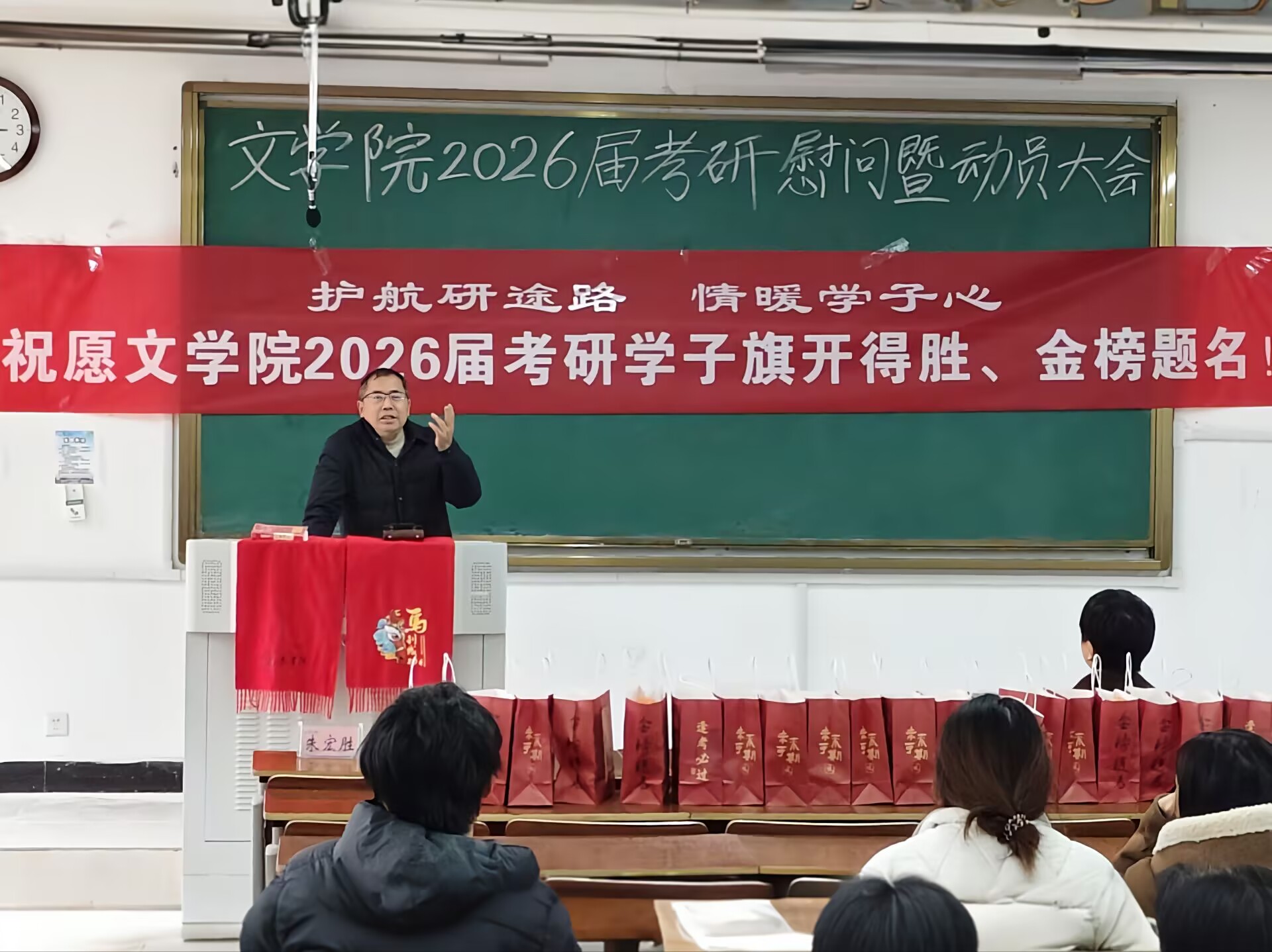 为有效缓解考研学子备考压力,增强信心、传递温暖,12月10日,文学院于文端楼2205教室召开2026届考研学生慰问暨动员大会。院党总支副书记周志荣、副院长朱宏胜、毕业班辅导员、全院2026届考研学生参会,会议由院团委负责人王星勇主持。
