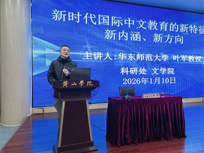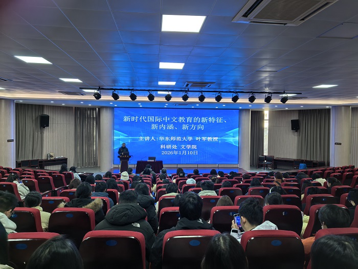 2026年1月10日上午,华东师范大学国际汉语文化学院副院长、博士生导师,叶军教授应邀作题为“新时代国际中文教育:新特征、新内涵、新任务”的专题学术报告。会议由文学院院长沈昌明主持,我院师生约150人参加报告会。