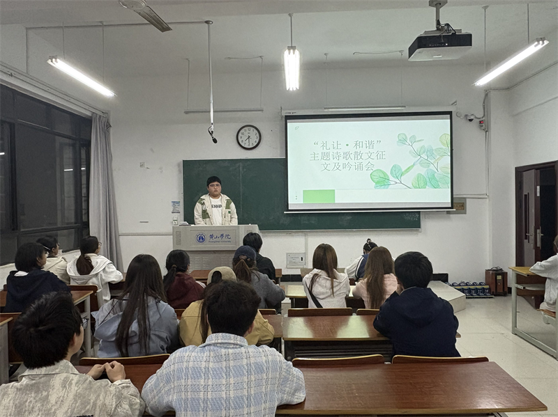 为深入挖掘中华优秀传统文化中“礼让、和谐”的时代价值,丰富校园文化育人载体,引导学生在创作与吟诵中涵养谦逊之风、筑牢文化自信,25汉教班于3月26日在文端楼2103成功举办“礼让和谐”主题诗歌散文征文及吟诵会。